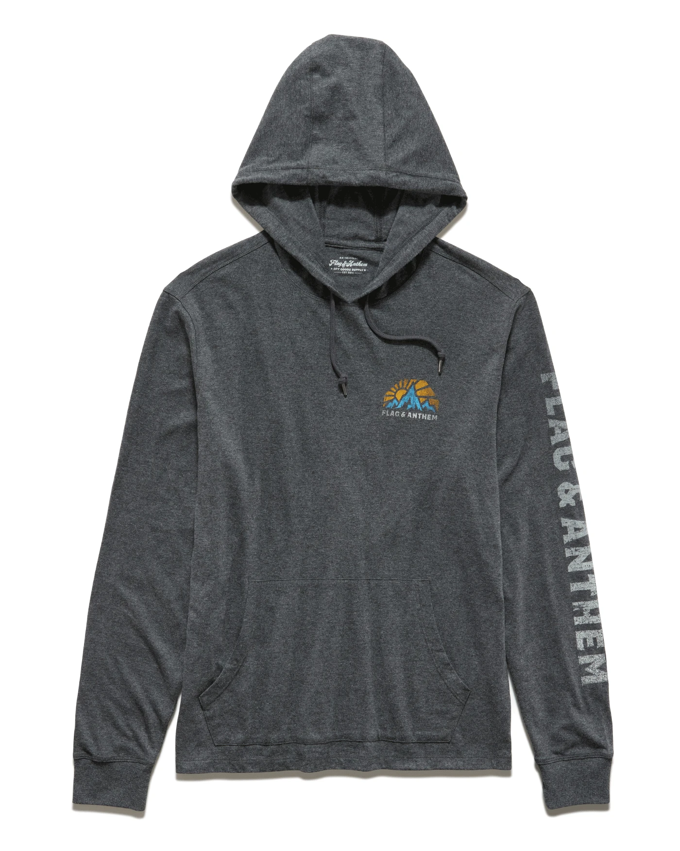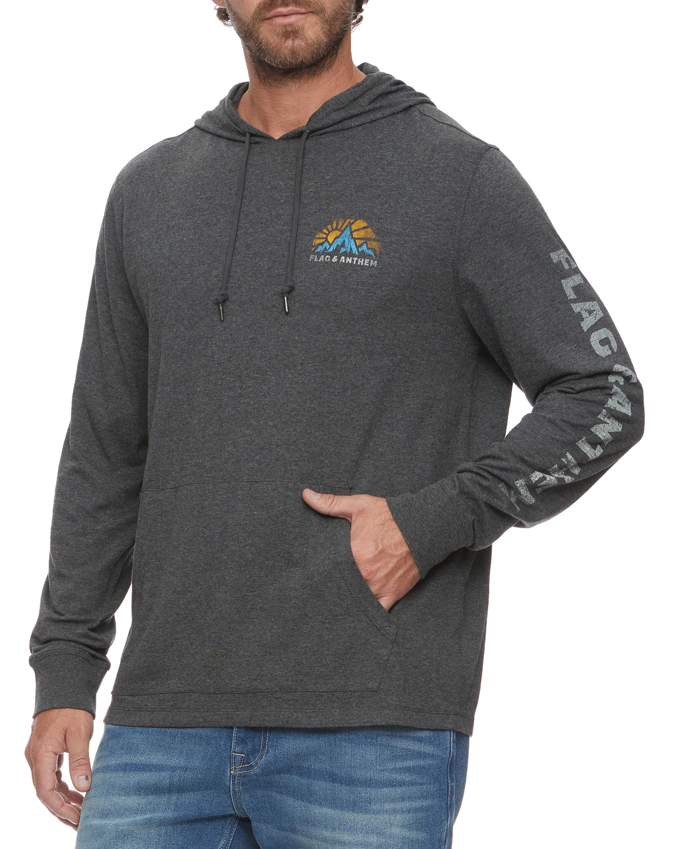 This lightweight jersey hoodie will likely be the most comfortable one you’ll own. Made from a special blend of super-soft fabrics, impeccably tailored for an always-perfect fit, itโs our go-to layer for cool summer nights, crisp fall mornings, and every moment in between. All-original Flag & Anthem graphic artwork on the wearer’s left chest and back. Contrast color fabric inside adjustable drawstring hood; functional kangaroo front pocket. Flag & Anthem wordmark logo along left sleeve. Tailored athletic fit.